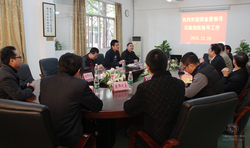 2016年 12月29日上午,共青团广东省委学校部副部长朱瑞峰一行专程考察蓝天技校。广州市蓝天技工学校董事长纪少游代表学校对朱部长一行的到来表示欢迎,并就蓝天技校办学概况向朱部长做了简要的介绍。