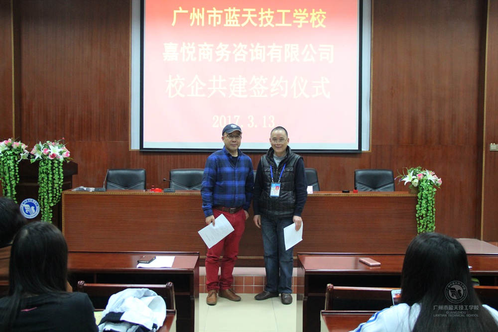在与会人员的见证下,杨长生副校长与嘉悦公司粱仲明总监分别在校企合作协议上签字,并合影留念。