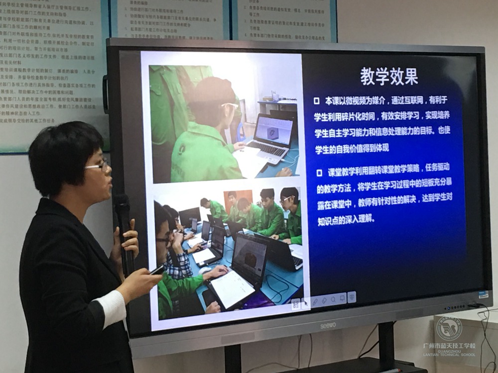 本次决赛在广东省国防科技技师学院举办。蓝天技校获奖作品2项,一是“机电类”:《模具CAD分模设计—模具坐标系的设置》,团队成员是刁少华、熊文斌老师,由刁少华老师登台主讲;二是“就业与创业指导课程”:《技校生就业与创业指导》——求职形象设计,团队成员是怀文静、王茂禧老师,由怀文静登台老师主讲。