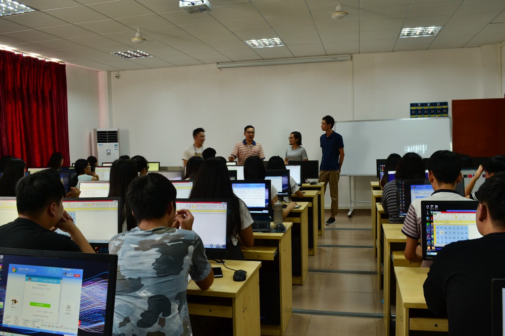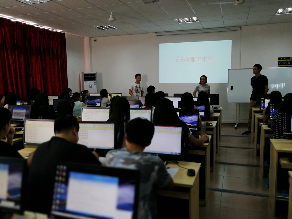 在电商系苏主任的带领下,廖经理和严经理参观了京东客服实训工作室。该工作室以京东以依托,学员接受京东的客服体系培训。廖经理和严经理现场向工作室的学生简要介绍了京东客服工作人员的岗位要求和日常工作内容,并与在场的学生交流互动,现场气氛非常活跃。“蓝天”京东客服实训工作室按京东的客服工作岗位要求开展培养教学,学员经考核合格,毕业后可直接到京东华南分公司的客服部门就职。