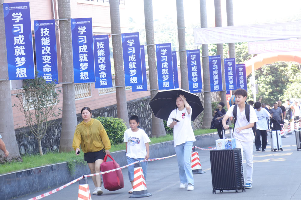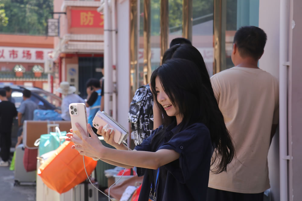顺着人流望去,五颜六色的行李箱排成了“长龙”,脚步声、笑声、问候声交织成新学期最热闹的“开场白”。校园里,新面孔穿梭往来,朝气与期待在每一寸空气里涌动。老生志愿者们奔走各处,搬行李、指路线,用热情消解萌新的陌生感,让初遇满是暖意。